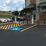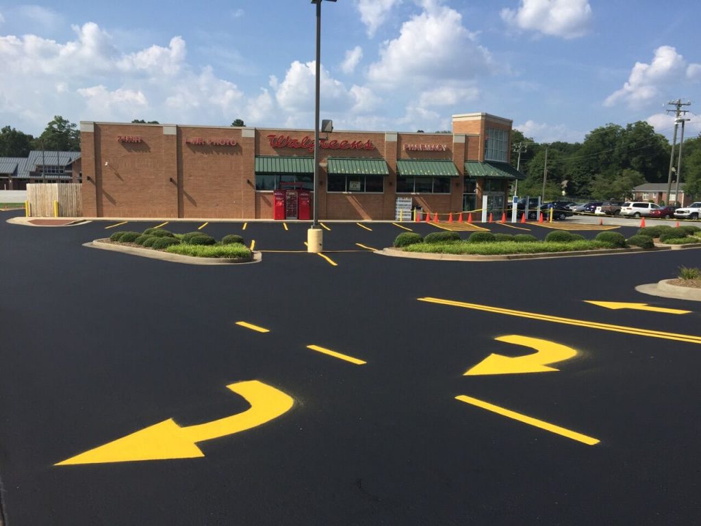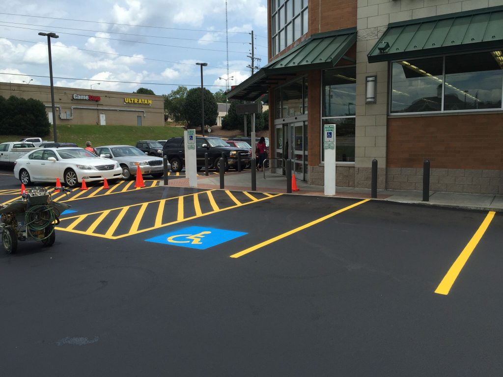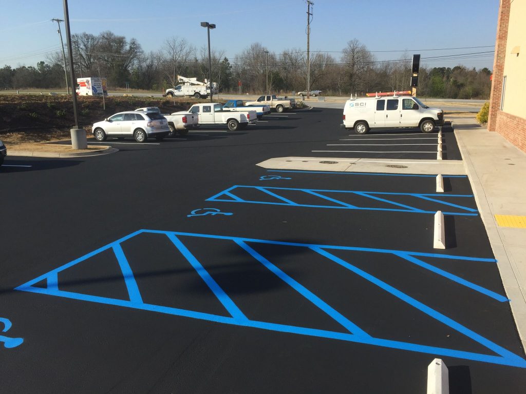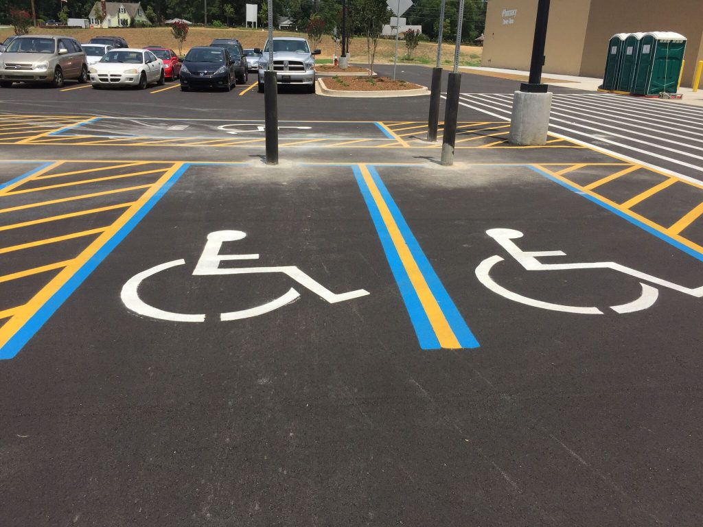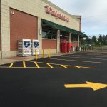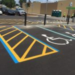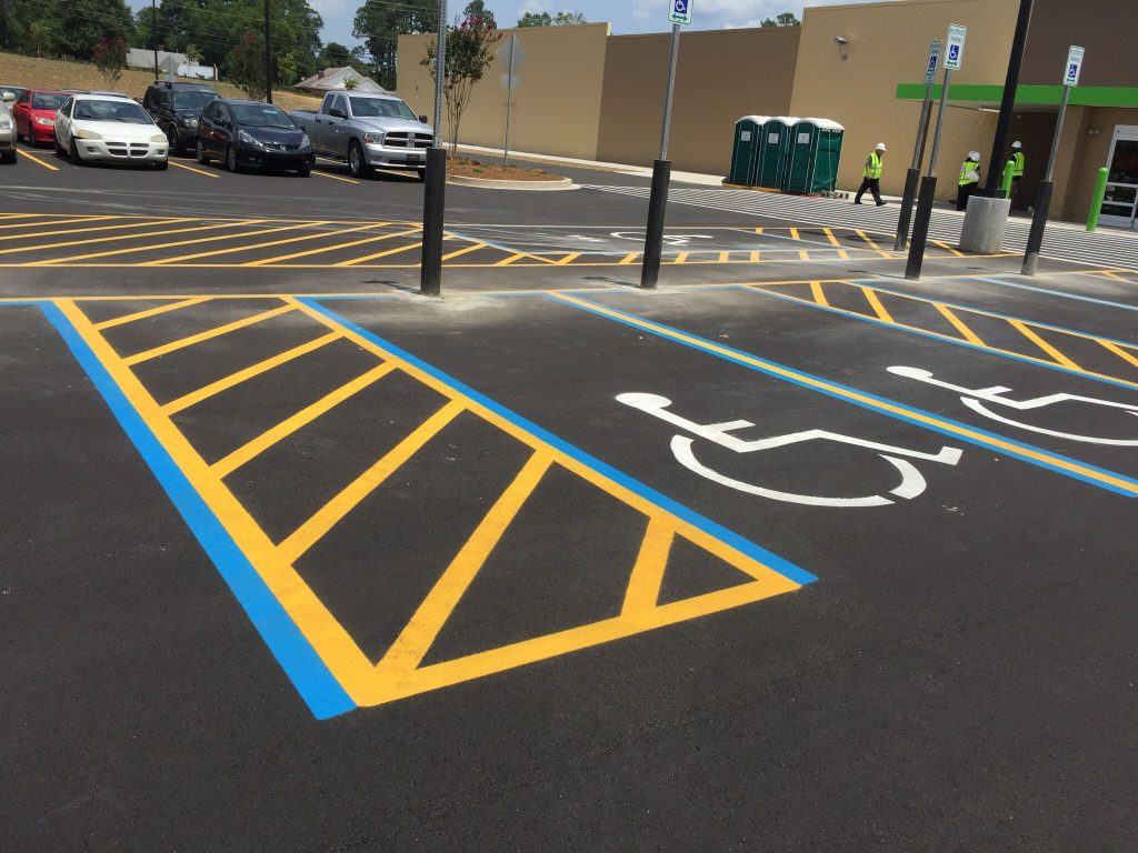 Professional striping assists your visitors in the safe use of your parking lot. It directs traffic to the proper route of entrance and exit, allowable areas to park, loading zones, crosswalks, and defines drive aisles that are wide enough to avoid accidents with cars and pedestrians. Properly designed parking spaces also maximize the number of cars you can safely accommodate.